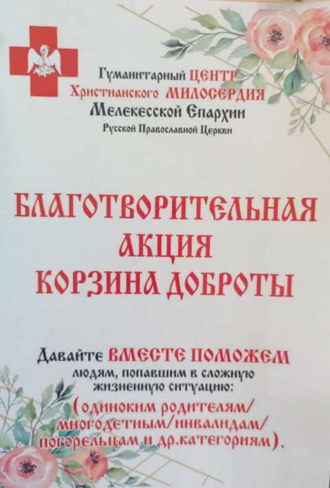 Друзья, в нашем городе состоится очередная благотворительная акция «Корзина доброты», которую организуют Гуманитарный Центр Христианского Милосердия Мелекесской епархии и Банк еды «Русь» с целью поддержать людей оказавшихся в трудной жизненной ситуации.