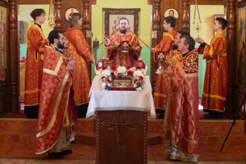 По окончании Литургии был совершен крестный ход вокруг храма и прочитана молитва на раздробление артоса. Затем артос был роздан прихожанам.