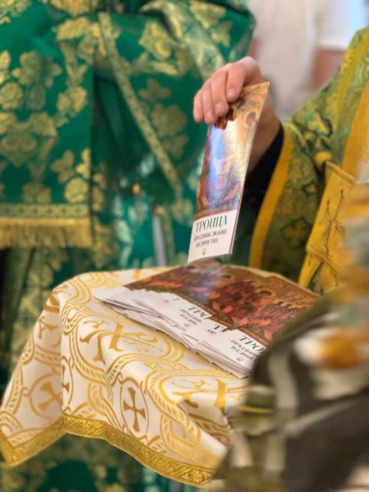 Во время помазания раздавали буклеты,, поясняющие смысл праздника Святой Троицы.