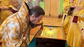 По заамвонной молитве Владыка Диодор совершил славление перед мощами святых преподобноисповедника Гавриила архимандрита Мелекесского и блаженного Андрея Симбирского.