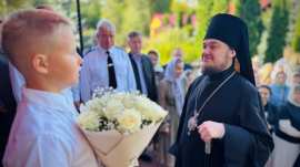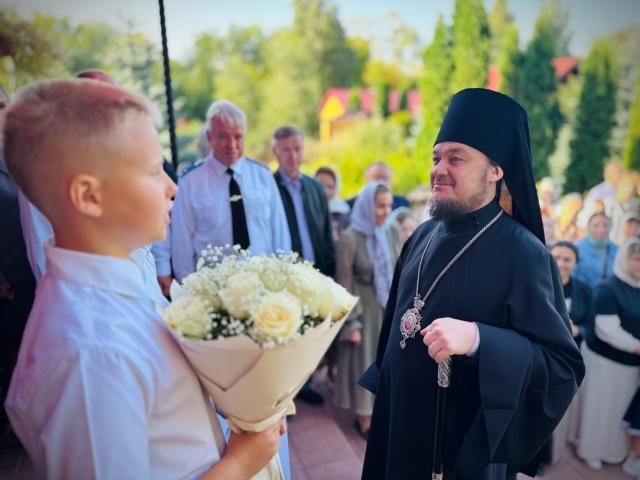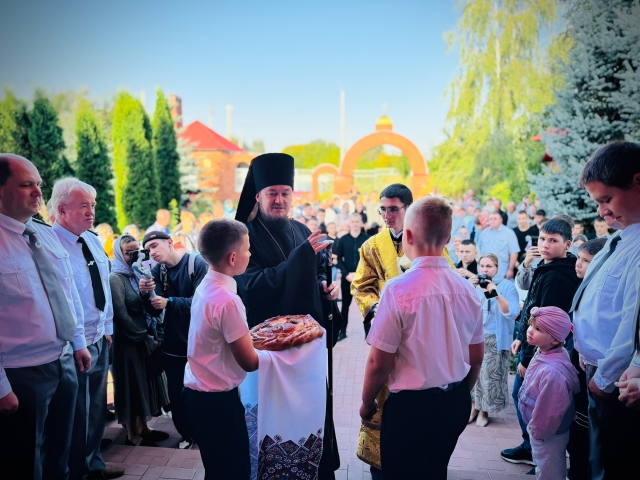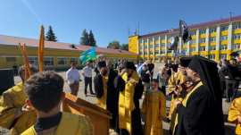 По заамвонной молитве Владыка Диодор совершил славление перед иконой мучеников и чин молебного пения перед началом учения отроков. На этом особом богослужении вместе студенты и их родители молились о даровании учащимся Божиего благословения на весь предстоящий учебный год и по традиции Владыка окропил их святой водой.
