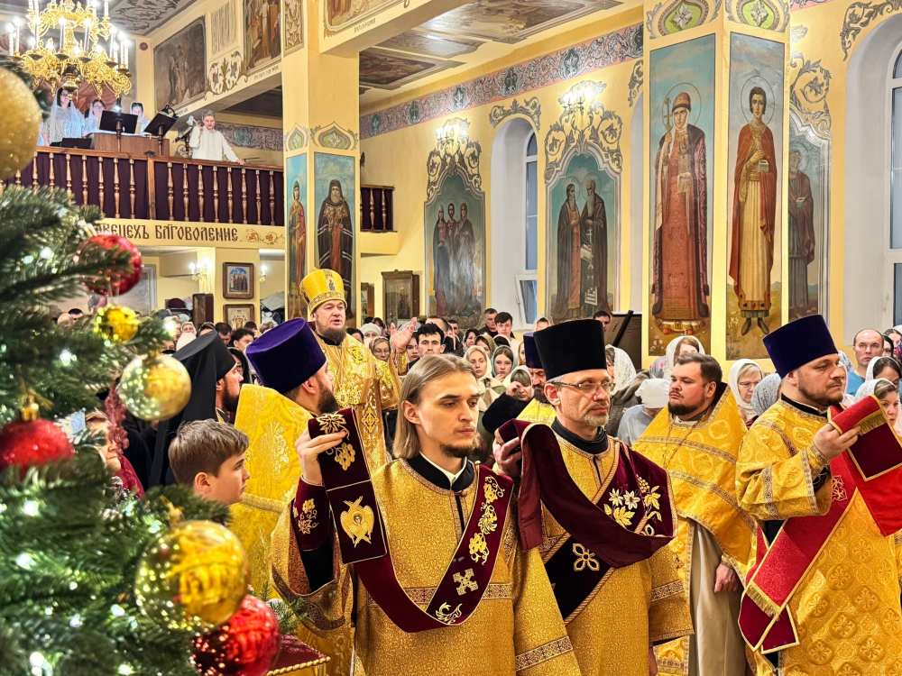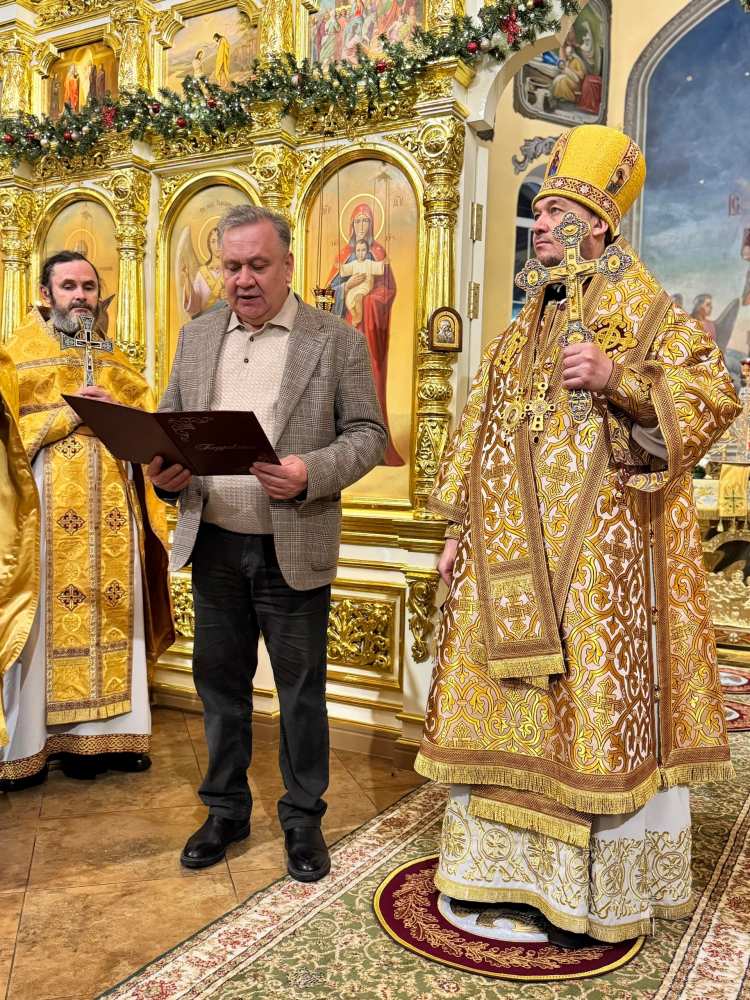 По окончании чтения Святого Евангелия Преосвященный Владыка обратился к верующим с архипастырской проповедью и зачитал Рождественское послание Святейшего Патриарха Московского и всея Руси Кирилла архипастырям, пастырям, диаконам, монашествующим и всем верным чадам Русской Православной Церкви.