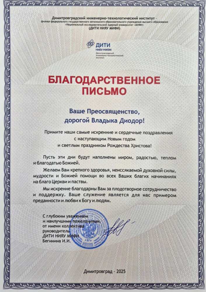 12 января 2026 года в ОГАОУ "ЛИЦЕЙ ЯДЕРНЫХ ТЕХНОЛОГИЙ" при НИЯУ МИФИ" состоялся отрытый урок по теме «От Вифлеема до Иордана. Свет, изменивший мир», в котором принял участие Его Преосвященство епископ Мелекесский и Чердаклинский Диодор.