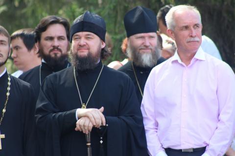 Сразу же после окончания Божественной Литургии, Преосвященный Владыка возглавил Крестный ход. В нем приняли участие, Клирики Епархии, врио губернатора Сергей Иванович Морозов, представители Администрации области и районов, многочисленные гости и жители поселка.