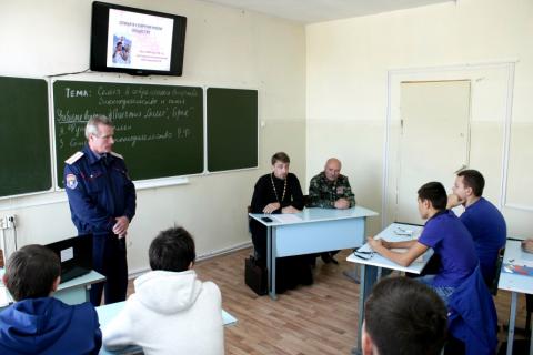Для разговора на эту важную тему были приглашены духовник учебного заведения протоиерей Андрей Орехов и старейшина Волжского казачьего войска, почетный гражданин г. Димитровграда, войсковой старшина Валерий Андреевич Солнышкин.
