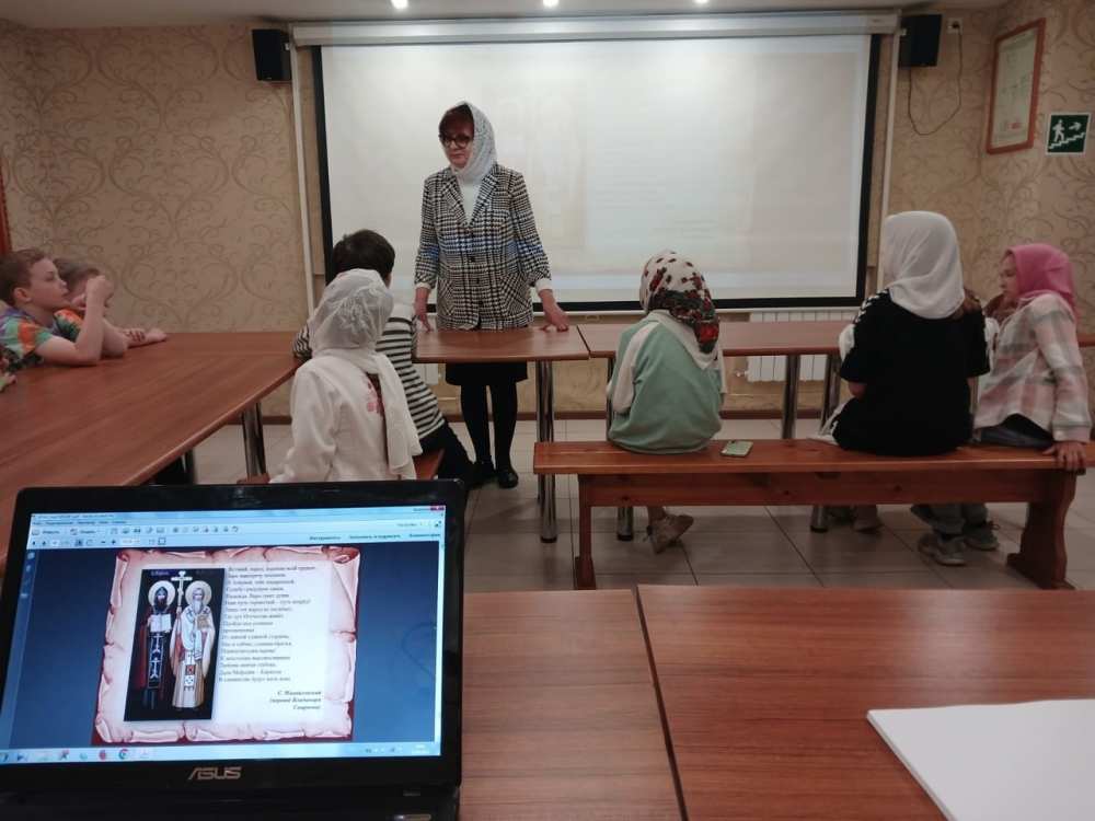 Педагоги Воскресной школы Макарова Е.В. и Петрова И.Ф. подготовили содержательную презентацию, посвященную Дню славянской письменности и культуры, рассказали о жизни и служении святых создателей славянской азбуки, их вкладе в язык и культуру нашей страны и других славянских народов, о значении славянской письменности в судьбе этих народов, имеющих общие традиции и культуру.
