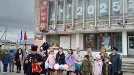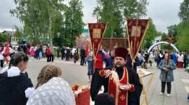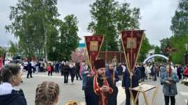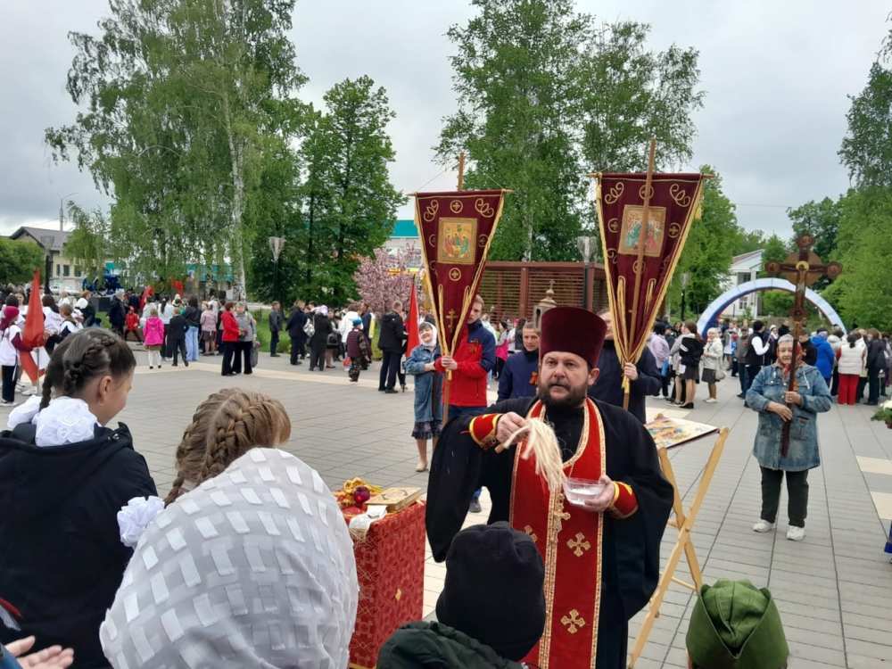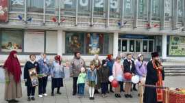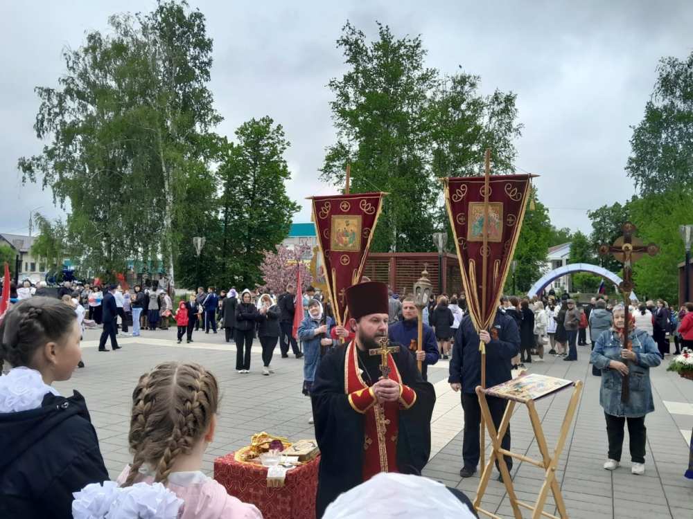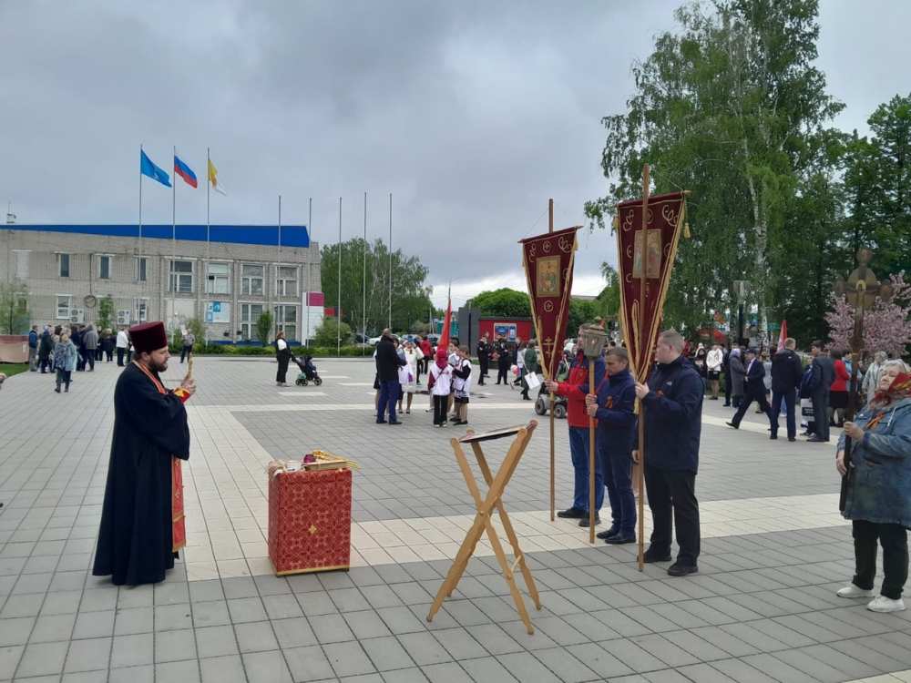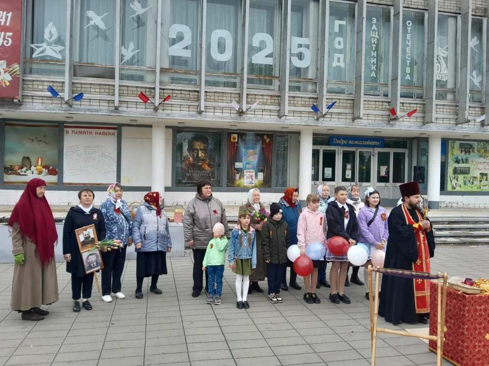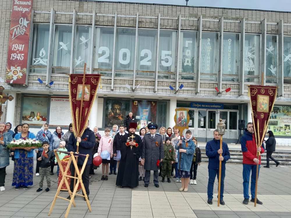 Утром отец Алексей совершил молебен о даровании Победы, после общим шествием прошли до парка Победы на митинг и возложили цветы к памятнику. Победы в Великой Отечественной войне.