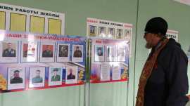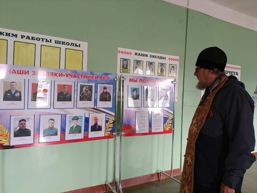 Батюшка посетил также школу в с.Александровка, где представлена выставка участников СВО.