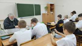 Батюшка рассказал ребятам, что данная организация преследует своей целью изучение православной веры, истории и традиции Отечества, участия в Богослужениях, социального служения, и.т.д.
