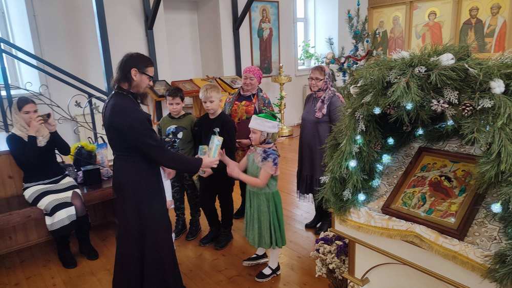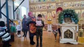 Всех присутствующих поздравил настоятель храма протоиерей Александр Титов. А затем дети рассказали стих о празднике и спели песню. Всем детям вручили сладкие подарки предоставленные благотворителями ООО "Сладкая жизнь" г. Димитровград.