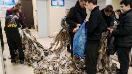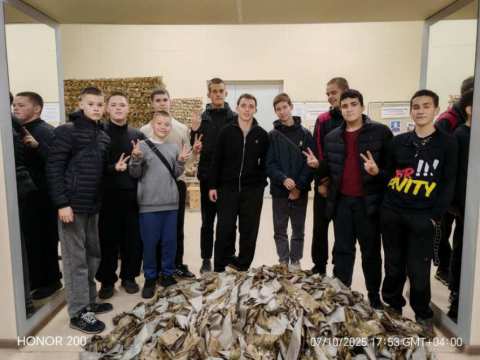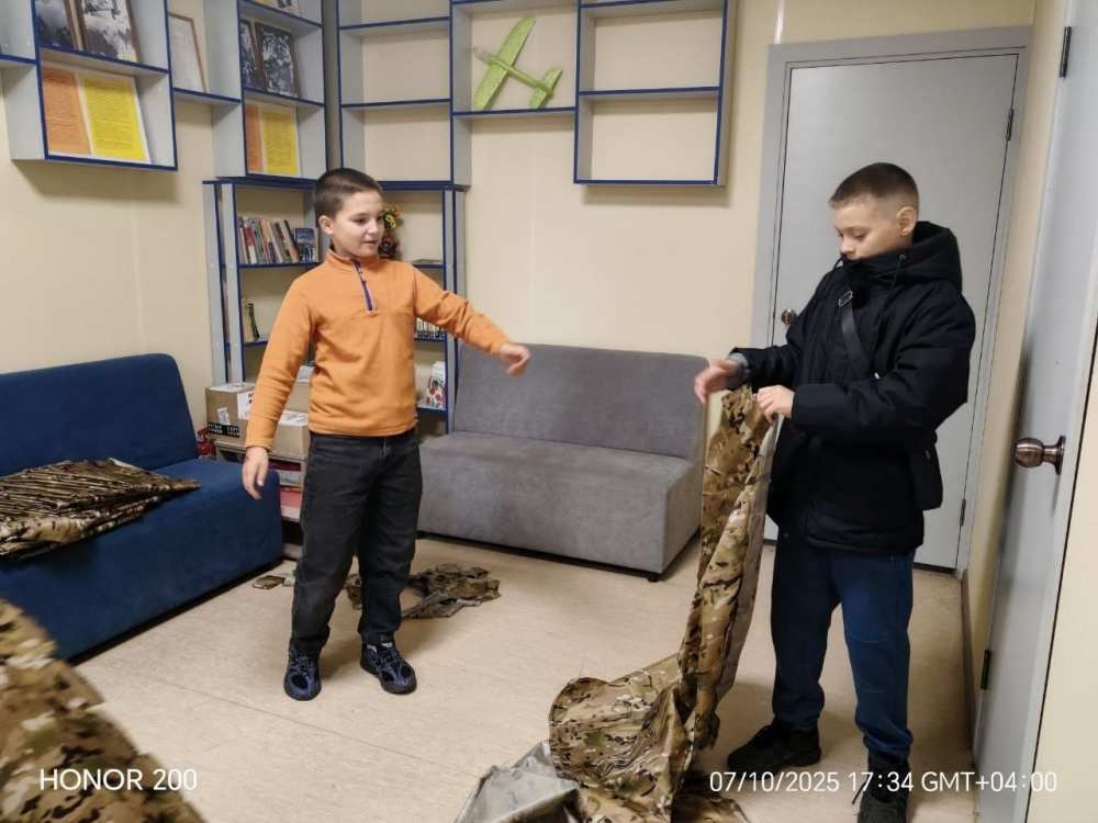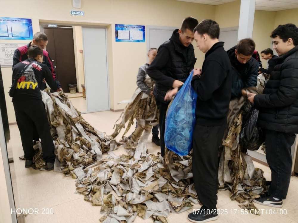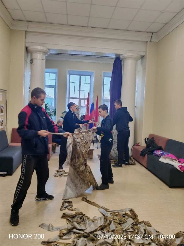 Заготовка лент для плетения маскировочных сетей воинам СВО требует хорошей физической подготовки. На помощь патриотическому отряду "ZA РОДИНУ", 7 октября 2025 года пришли братья из Молодежного патриотического братства "Пересвет" при храме св. мч. Татианы.