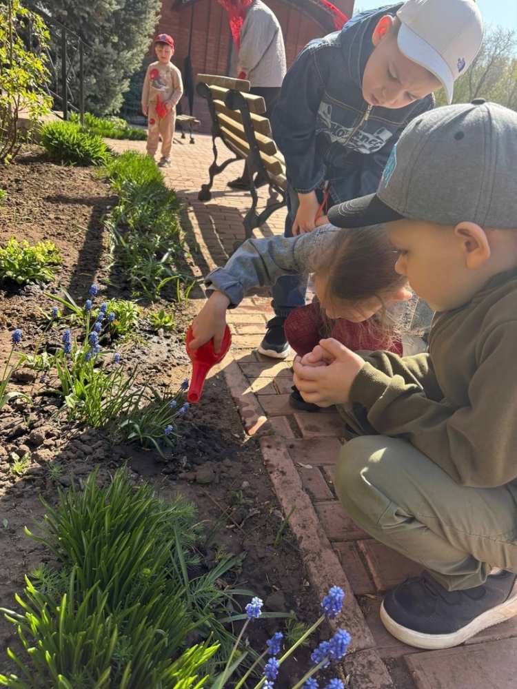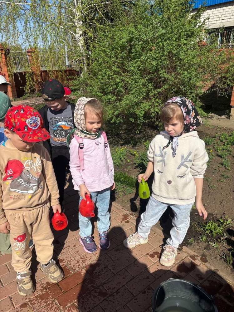 Затем под руководством воспитателей детского сада Родиной Н.В. и Денисовой Е.С. воспитанники помогли полить цветы на территории храмового комплекса.