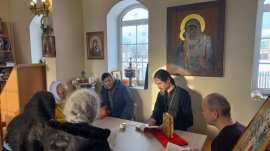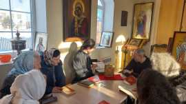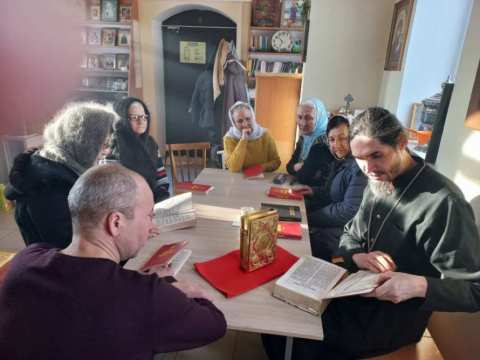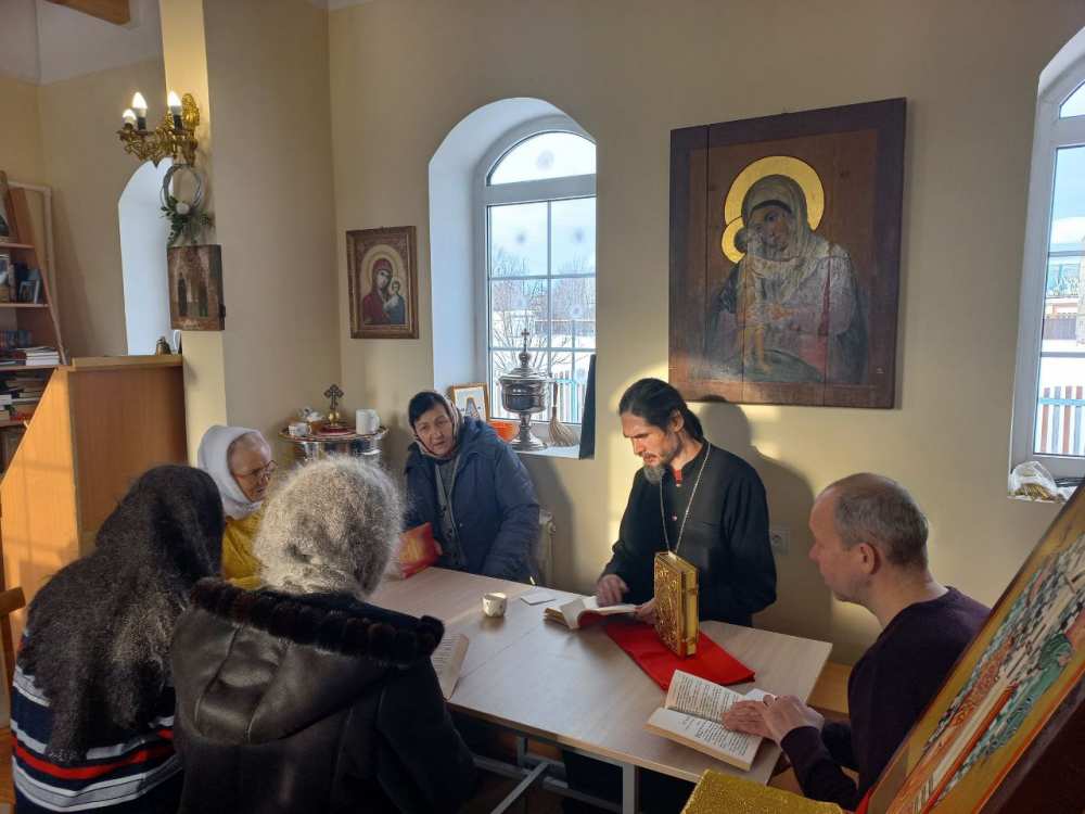 Настоятель храма иерей Евгений Тойменев провел вводный урок, объяснил прихожанам о структуре Библии, структуре Нового Завета, о значении Писания и Предания при изучении Священного Писания. Рассказал о важности и правильности толкования мест из Священного Писания, с отсылкой на Святых Отцов Церкви. Собравшиеся рассмотрели отрывок из 1 гл. от Марка.