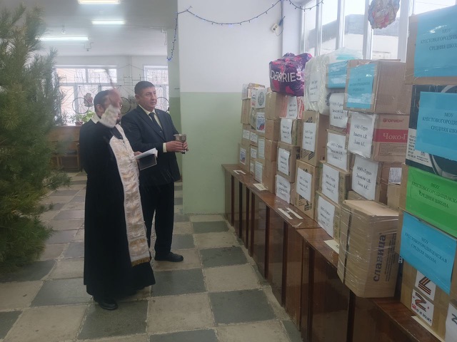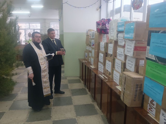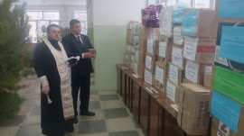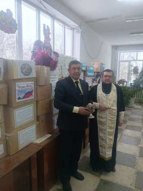 С молитвой священник окропил святой водой всю собранную гуманитарную помощью. В завершении отец Владимир поблагодарил главу Администрации Сидоркина Ивана Павловича, всех волонтёров и помощников, которые в меру своих сил стараются помогать нуждающимся и благословил на дальнейшие труды, желая всем милости Божией.