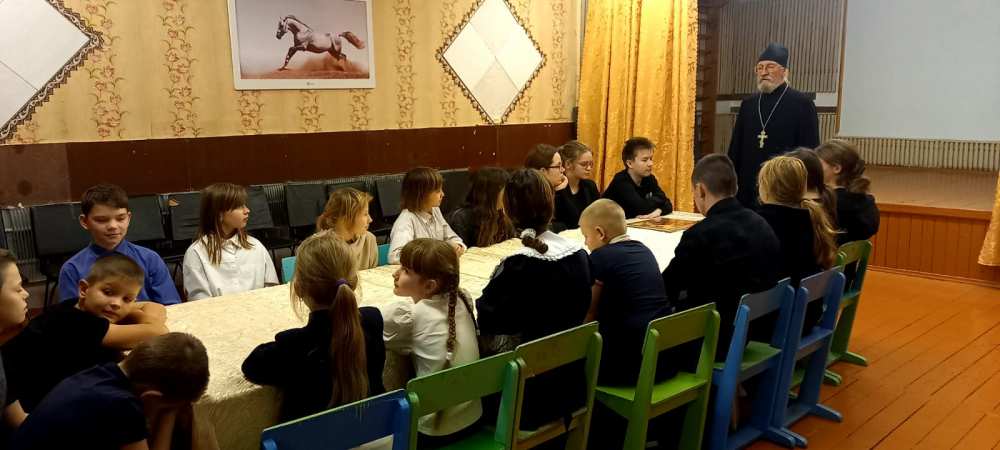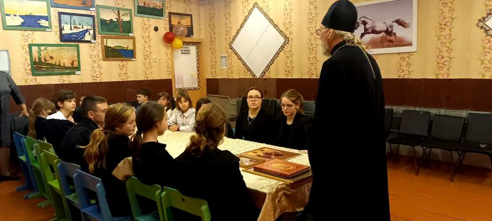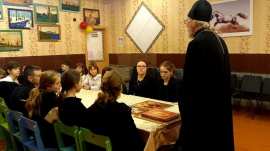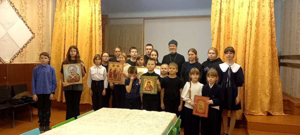 Настоятель храма Сошествие Святаго Духа на апостолов иерей Николай Маляганов рассказал детям о Пресвятой Богородице, о изображение Её на иконах. Ребята также участвовали в беседе . После мероприятия иконы были подарены школе.