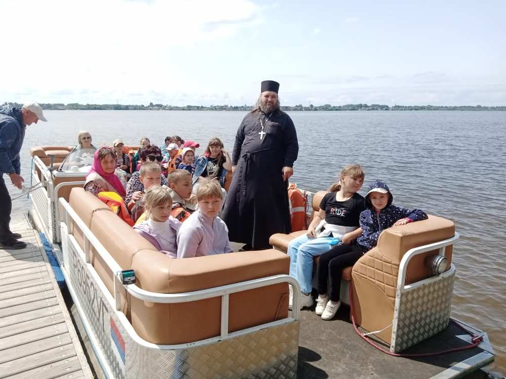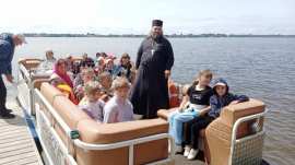 Деткам была проведена водная прогулка на катере и беседа священника о вере и любви к Отечеству во время общего чаепития.