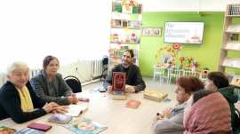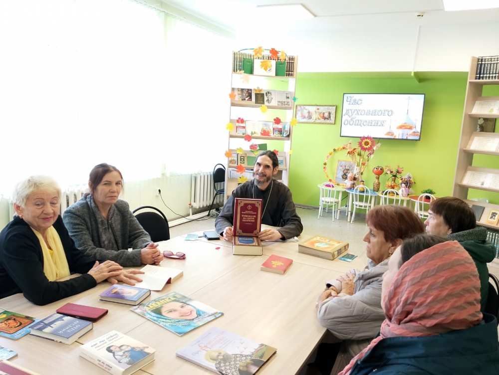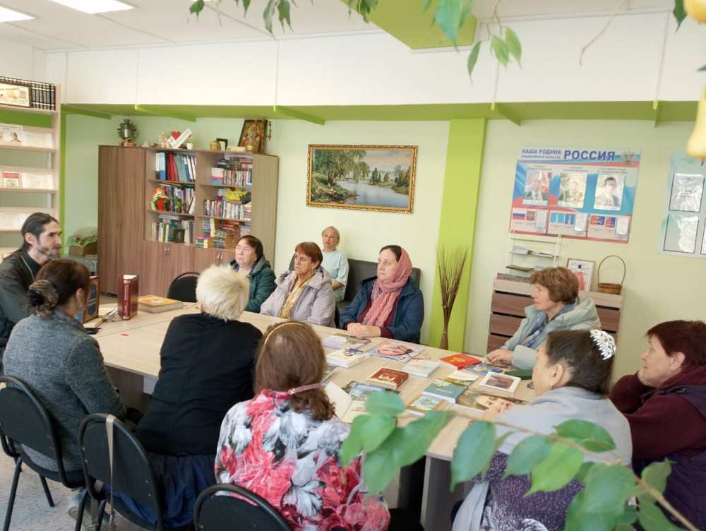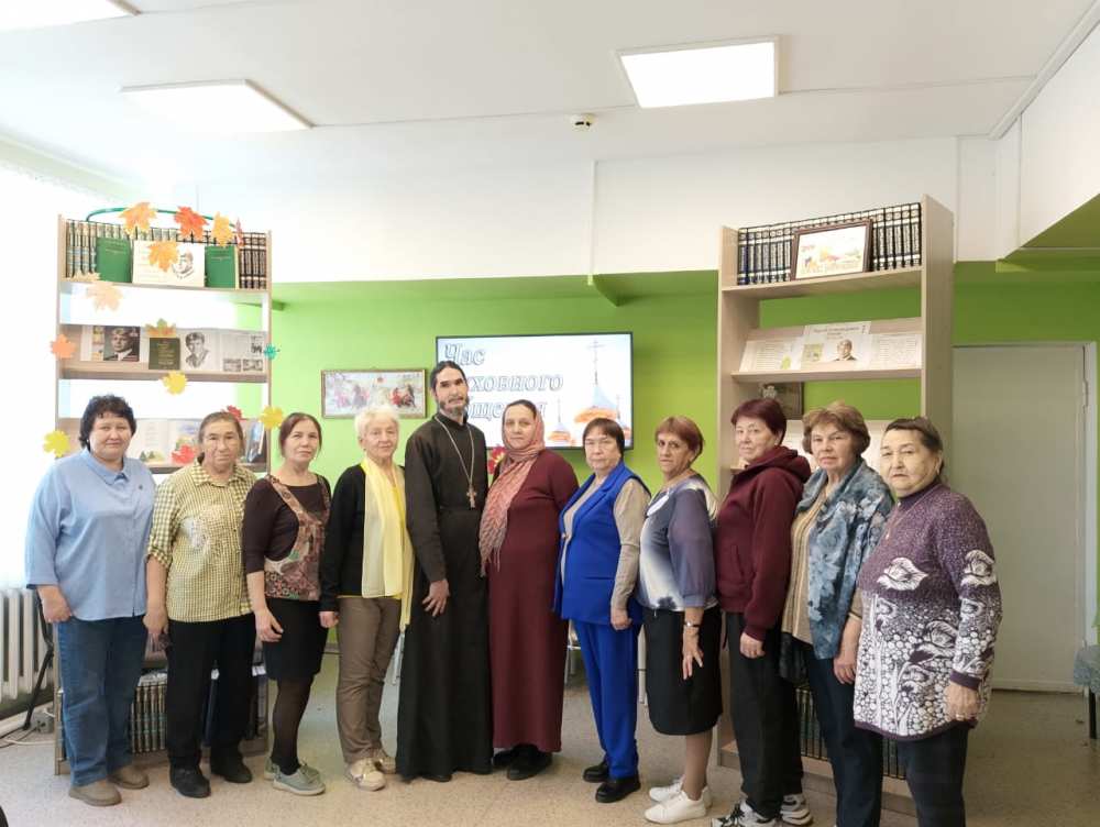 Настоятель храма Собора Архистратига Михаила и прочих Небесных Сил бесплотных с. Озерки иерей Евгений Тойменев с руководителем Сельской-библиотеки Лидией Афанасьевной, провел "Час духовности", на котором с присутствующими разобрали структуру Библии, отметили основные различия Нового и Ветхого завета, размышлял о Промысле Бога от Сотворения мира, до Рождества Иисуса Христа.