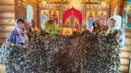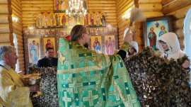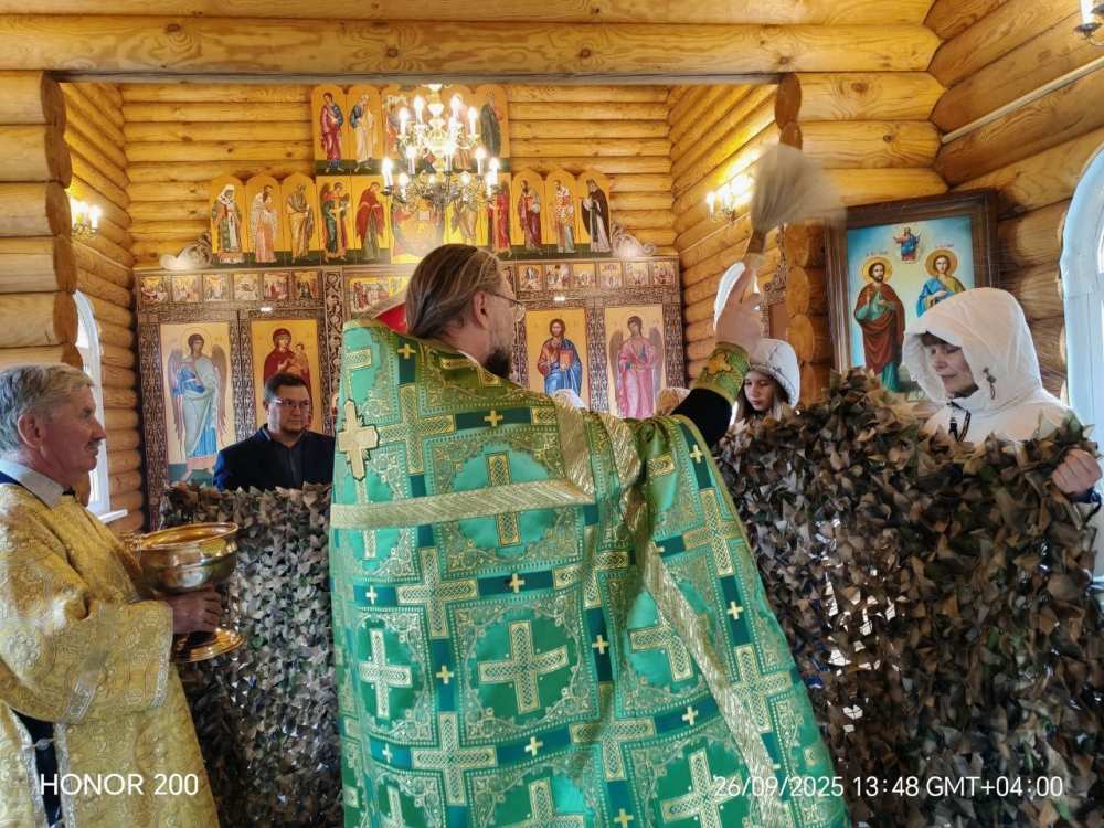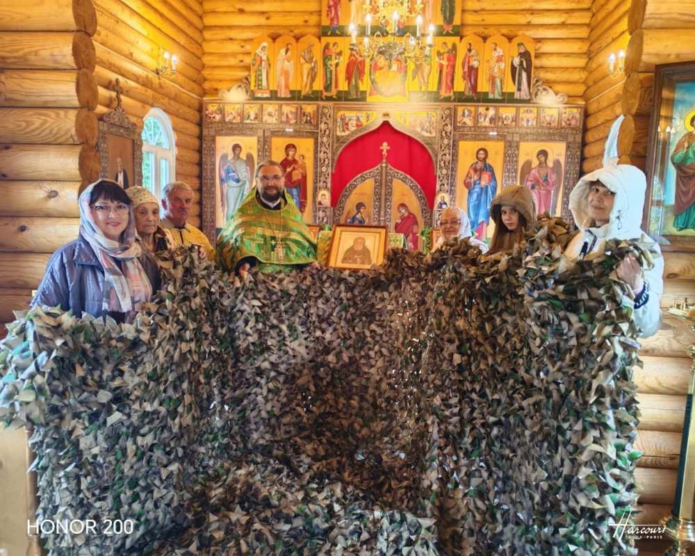 После богослужения о. Иона освятил маскировочные сети, изготовленные волонтерами патриотического отряда "Za Родину".