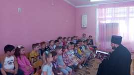 Батюшка провел познавательный час духовности. Дети узнали о праздниках Рождественского цикла (Рождество, Крещение, Сретение), послушали стихи, пословицы, загадки, увидели познавательные иллюстрации.