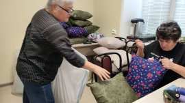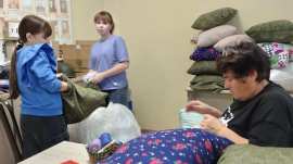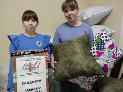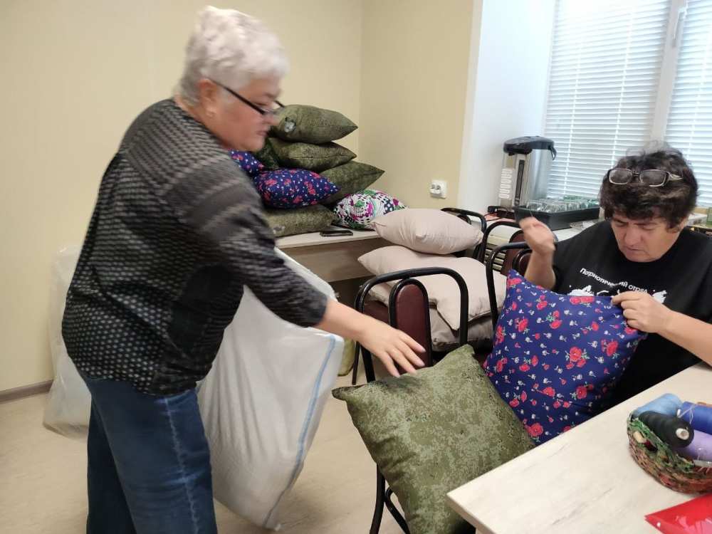 Сегодня нам помогают воспитанницы Воскресной школы Свято-Татианинского храма "Источник" Ирочка и Маша Плечовы. Шить подушки помогает волонтёр патриотического отряда "Zа Родину", Ольга Александровна Полковникова.