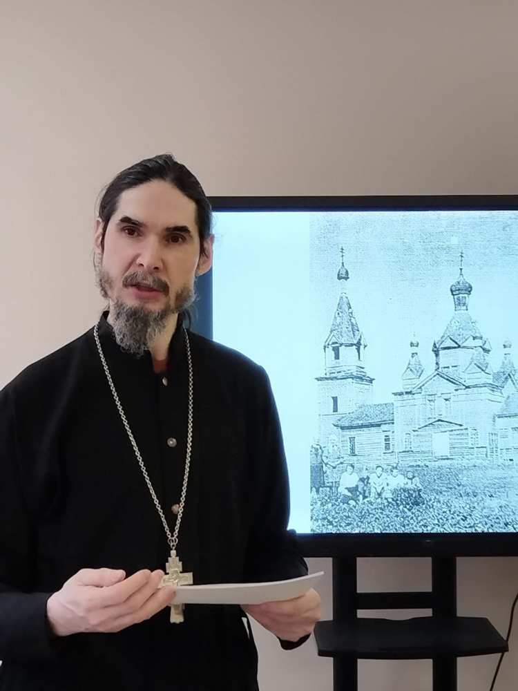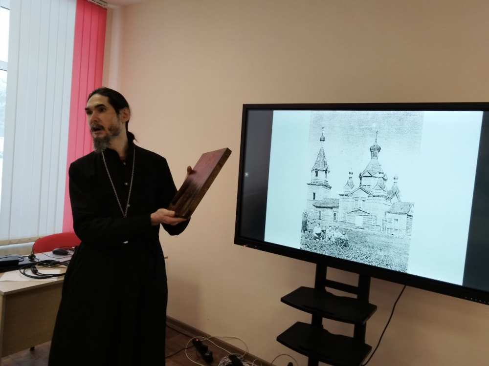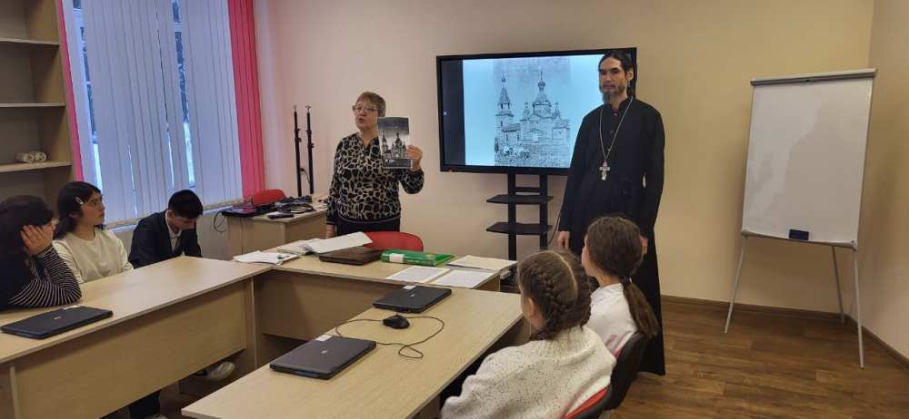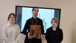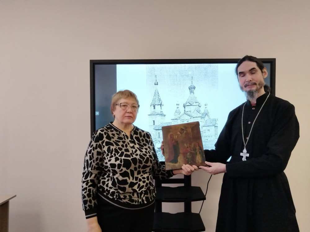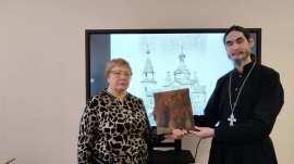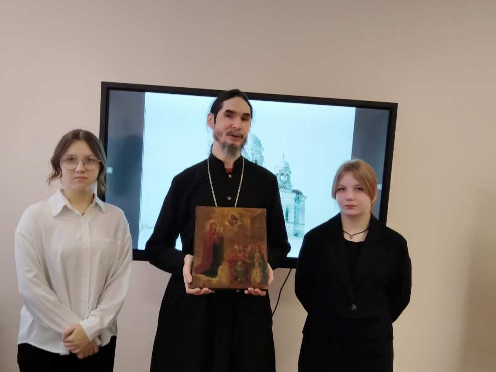 Выступающие вместе с учениками рассмотрели историю храмовой иконы Боголюбской Божией Матери - одной из первых приходских икон конца 19 века, села Архангельские Озерки.