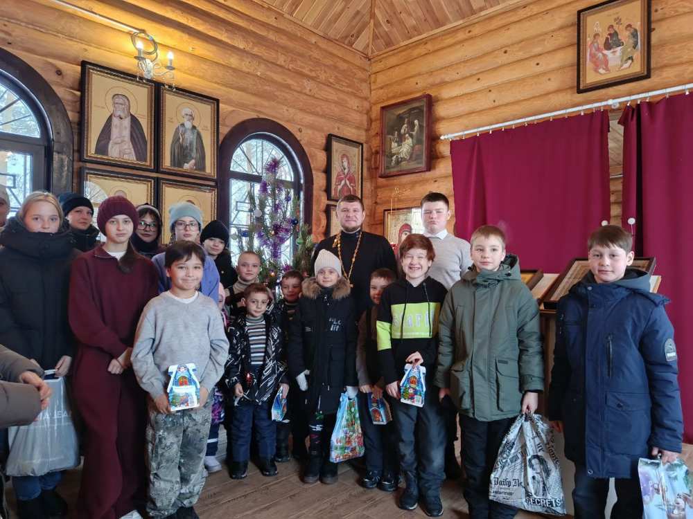 На ёлку были приглашены дети участников СВО и дети из Воскресной школы. Всем подарили подарки.