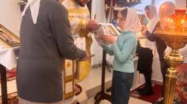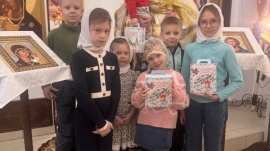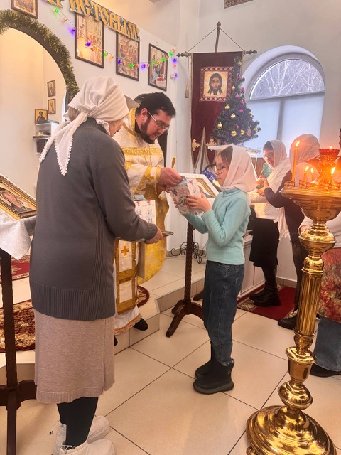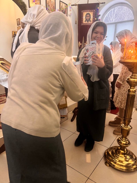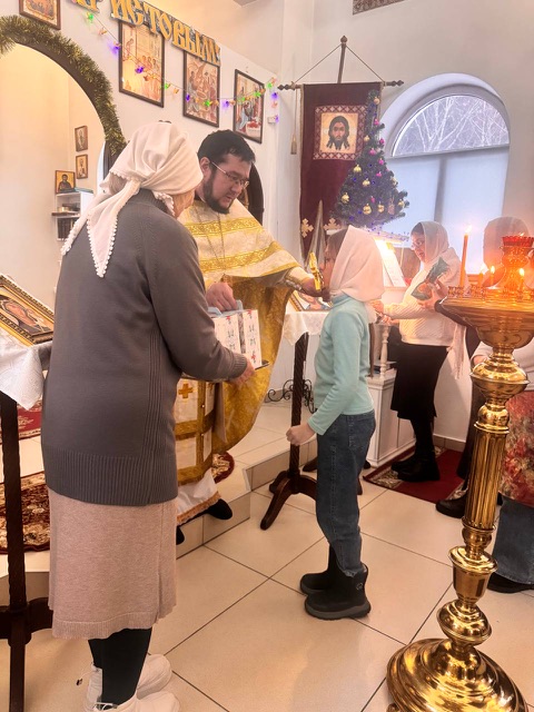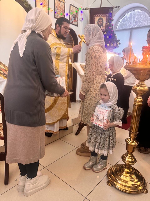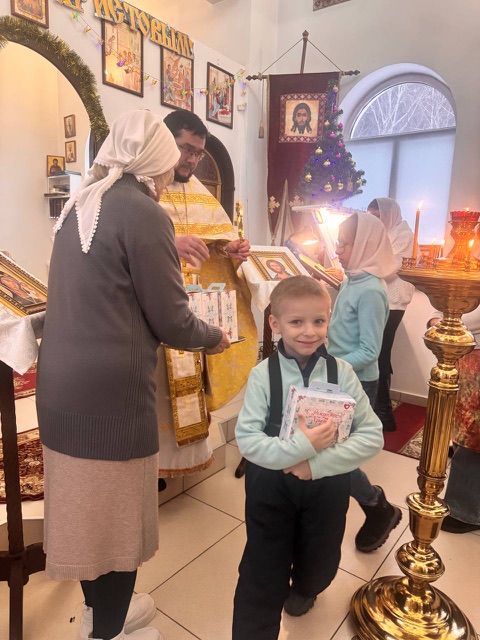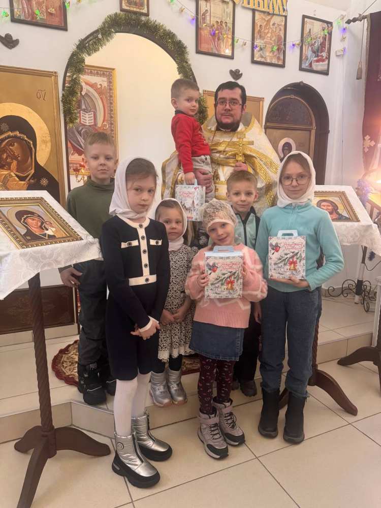 После богосдужения взрослые и дети исполнили Рождественские песнопения, прочитали стихи. Отец Владимир благословил детей и подарил сладкие подарки. Всё прошло в тёплой, домашней атмосфере.