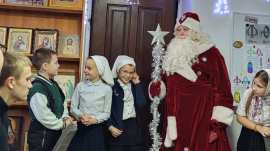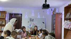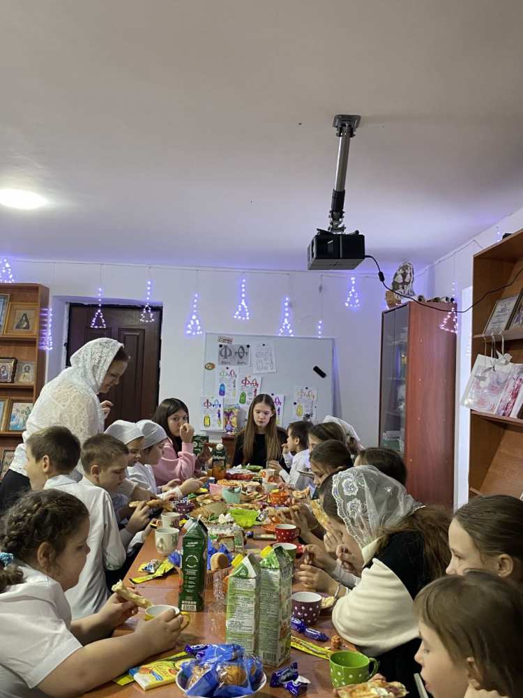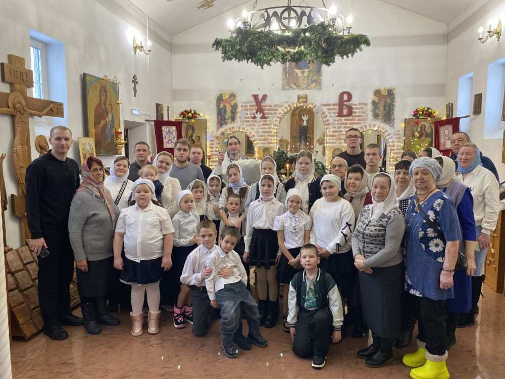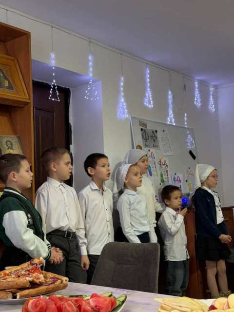 Взрослые спели Рождественские колядки. Настоятель храма иерей Евгений Тойменев поздравил присутствующих с праздником. Устроили праздничное чаепитие.