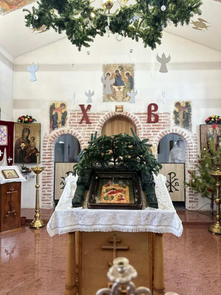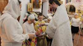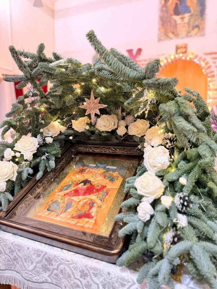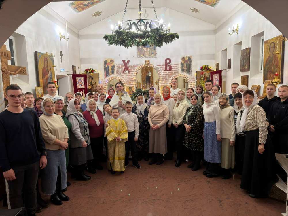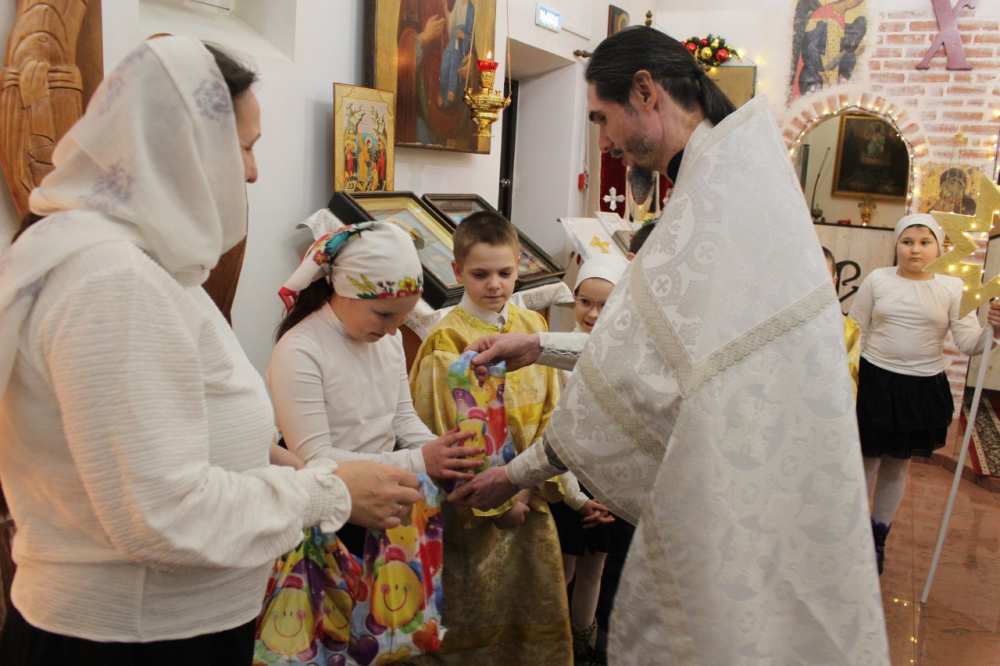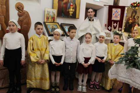 Настоятель храма поздравил прихожан и воспитанников Воскресной школы с праздником, дети подготовили поздравление для прихожан.