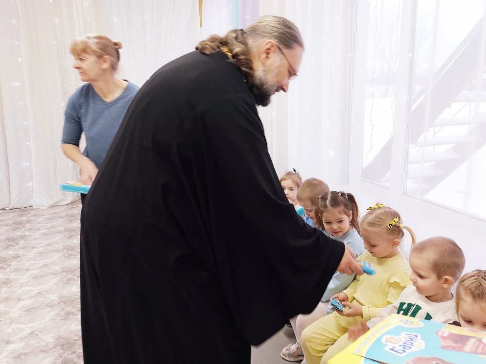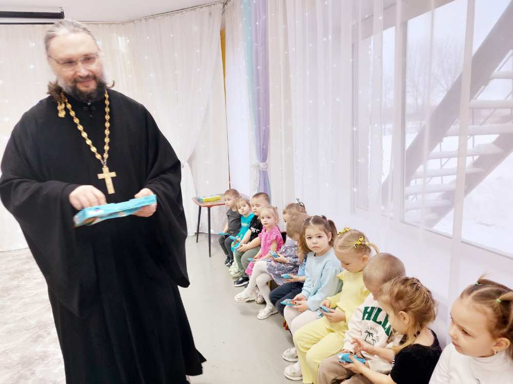 В Первомайском детском садике 13 января 2026 года проведено награждение победителей Приходского конкурса «Радость Рождества». Настоятель храма св. мц. Татианы пос. Октябрьский иеромонах Иона (Черкасов) и сотрудник Приходского Координационного совета Елена Макарова поздравили воспитанников с праздником Рождества Христова и подвели итоги коллективного конкурса в номинации «Лучшая Рождественская открытка», вручив подарки и грамоты.