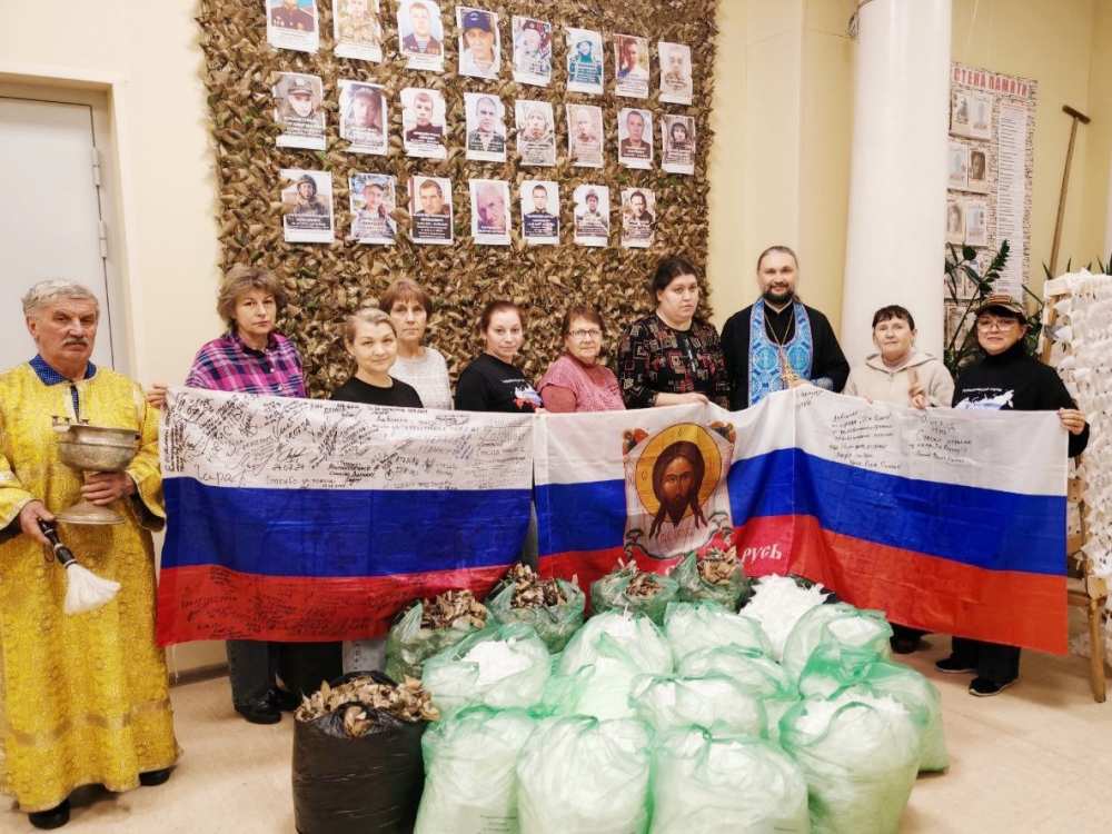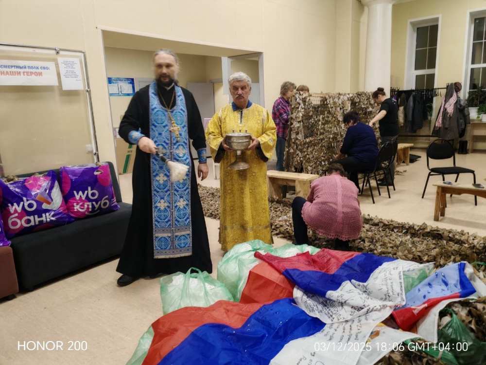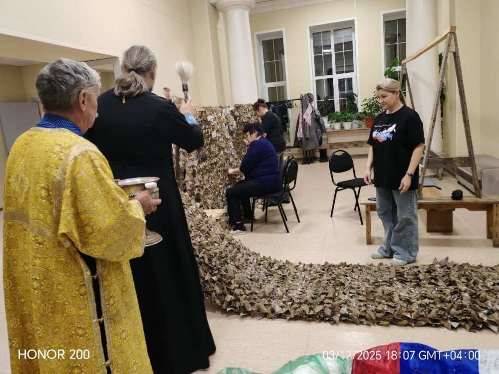 3 декабря 2025 года в Октябрьском Доме культуры руководитель Епархиального отдела по взаимодействию с Вооруженными Силами и правоохранительными органами Мелекесской епархии иеромонах Иона (Черкасов) освятил партию маскировочных сетей для воинов находящихся в зоне специальной военной операции, изготовленных волонтерами патриотического отряда "ZA Родину".