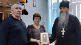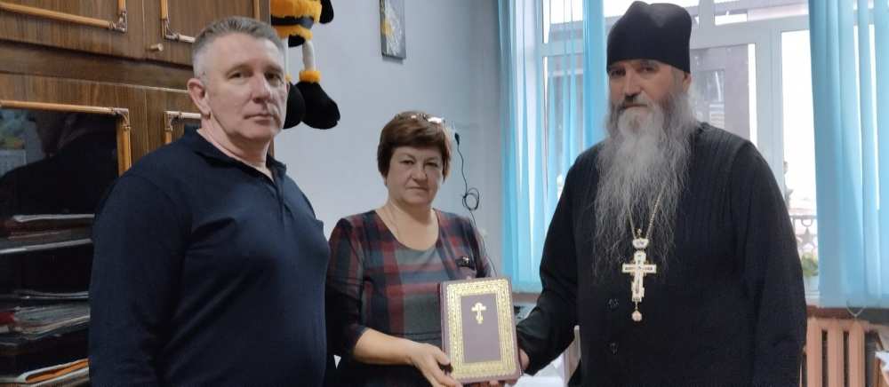 Отец Константин вручил Библию - памятный подарок для библиотеки заместителю директора по учебно-воспитательной работе О. Л. Тимоховой и классному руководителю С. М. Володчинкову.