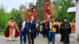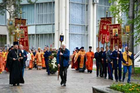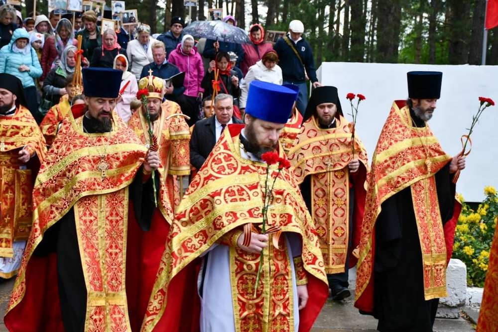Под Пасхальные песнопения, с хоругвями и портретами родственников не вернувшихся с войны, тружеников тыла Крестный ход проследовал к Монументу Славы и Вечному огню.