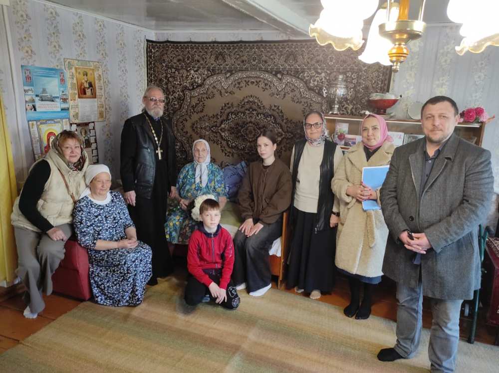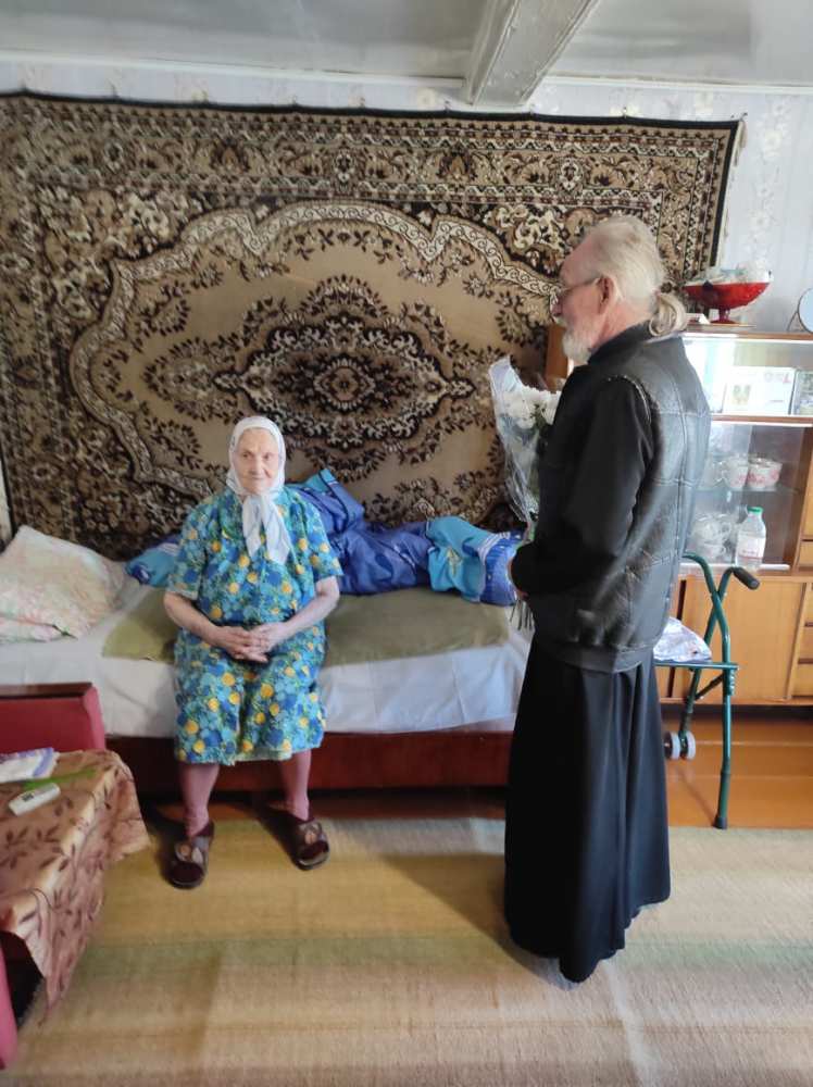 Отец Николай поздравил Марию Степановну с 95 летием и с Днем Победы и вручил цветы.
