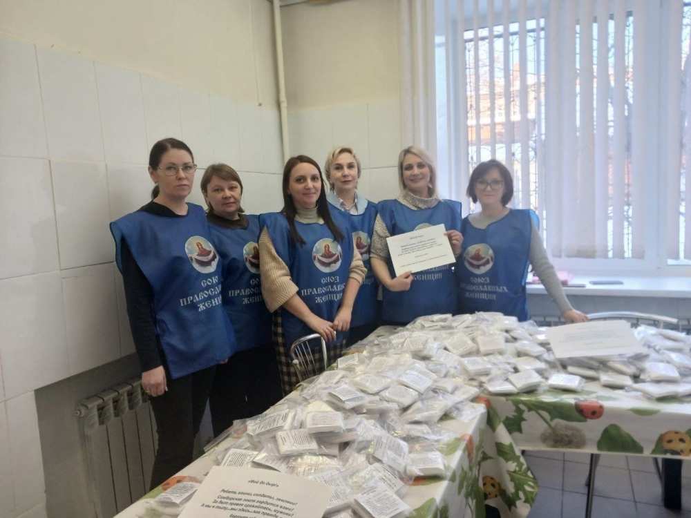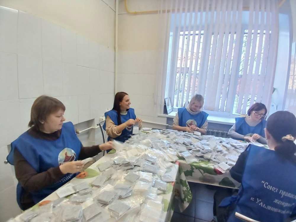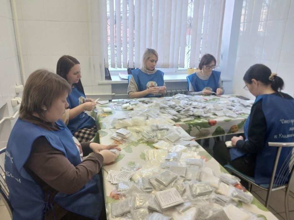 19 февраля 2026 года сотрудники Приходской социальной службы "От сердца к сердцу" Свято-Татианинского храма Петрова И.Ф. и Макарова Е.В. в составе коллектива "Союз Православных женщин" Ульяновской области приняли активное участие в изготовлении комплектов сухого душа для воинов СВО. Женщины с любовью подготовили 360 комплектов сухого армейского душа. Каждая упаковка несет в себе частичку тепла и молитвенных пожеланий о здравии. Подобные инициативы, рожденные из искреннего желания помочь, укрепляют дух бойцов и напоминают им, что дома их ждут и любят. В ближайшее время они будут отправлены нашим защитникам на передовую и в госпиталь.
