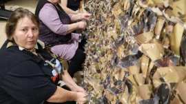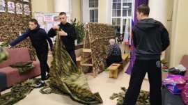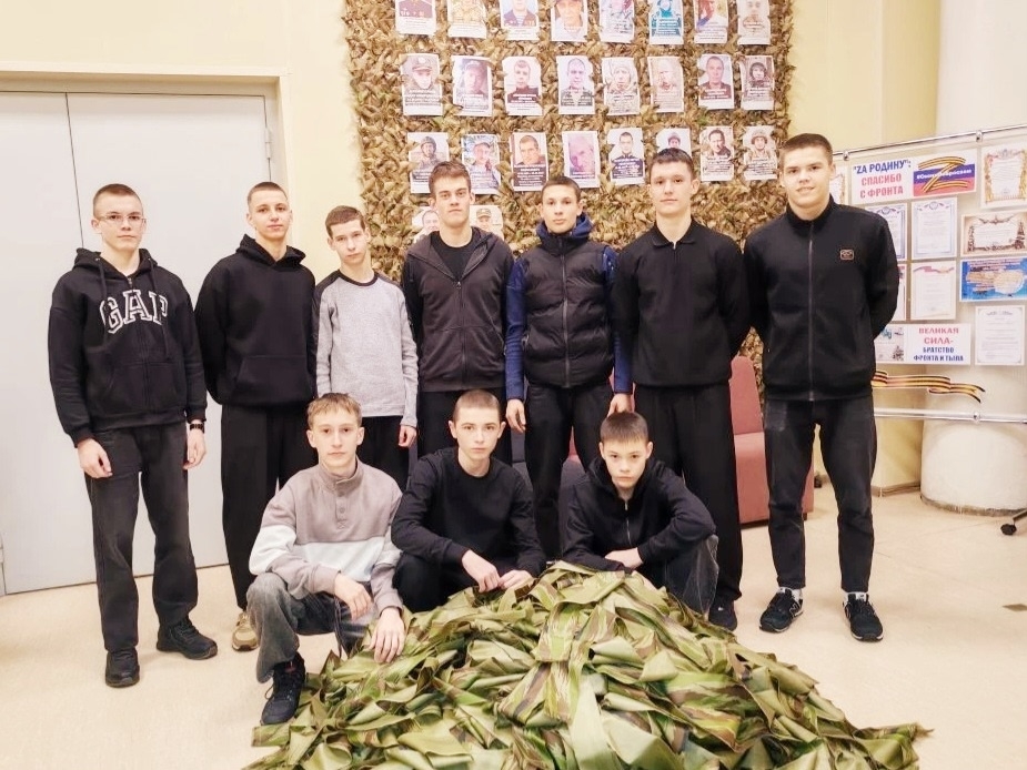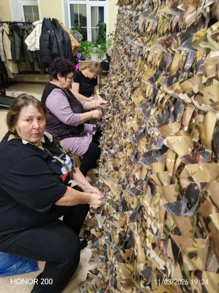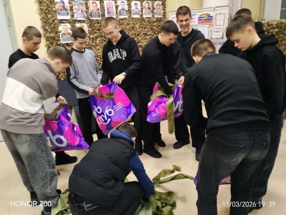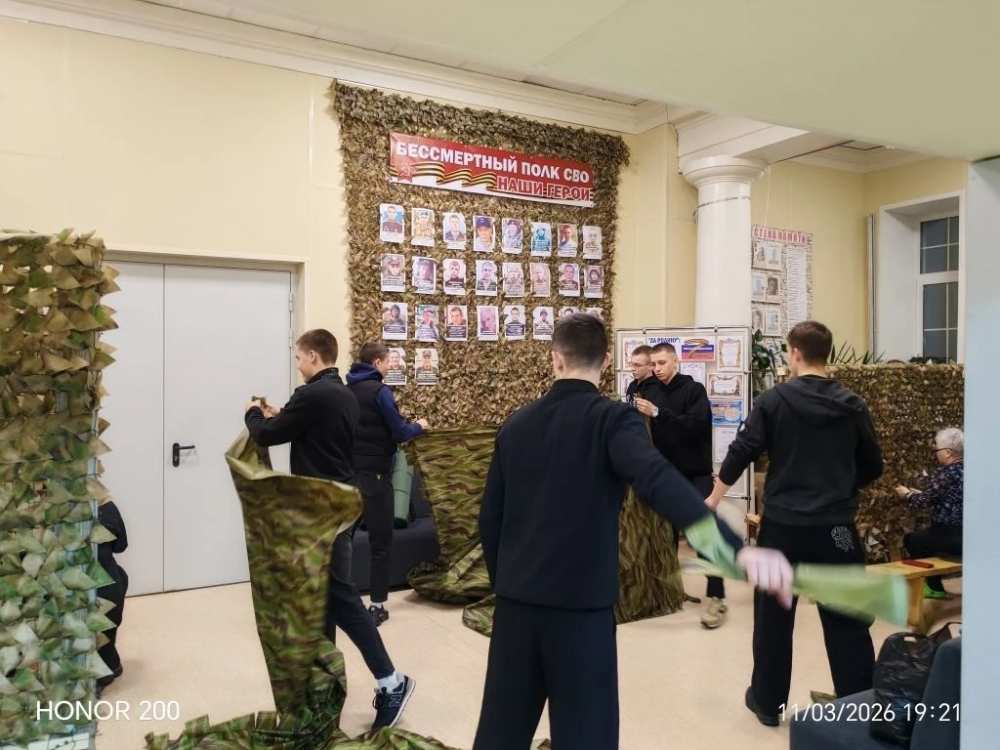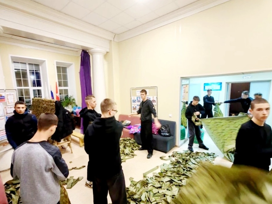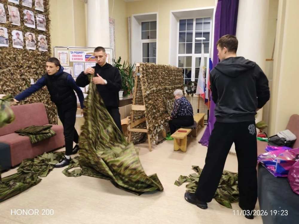 Патриотический отряд "Za Родину" и региональное молодежное патриотическое братство "Пересвет" в Октябрьском Доме культуры 11 марта 2026 года объединили свои усилия по изготовлению большой партии маскировочных сетей для воинов СВО.