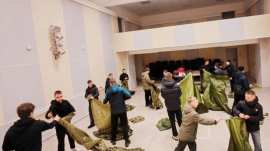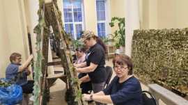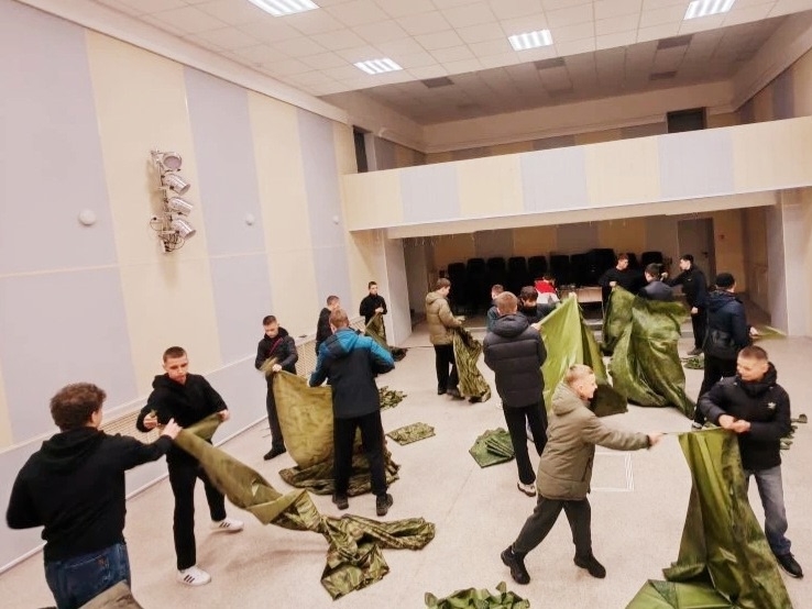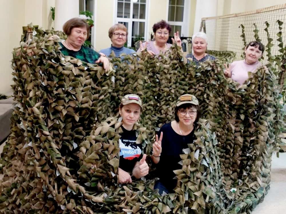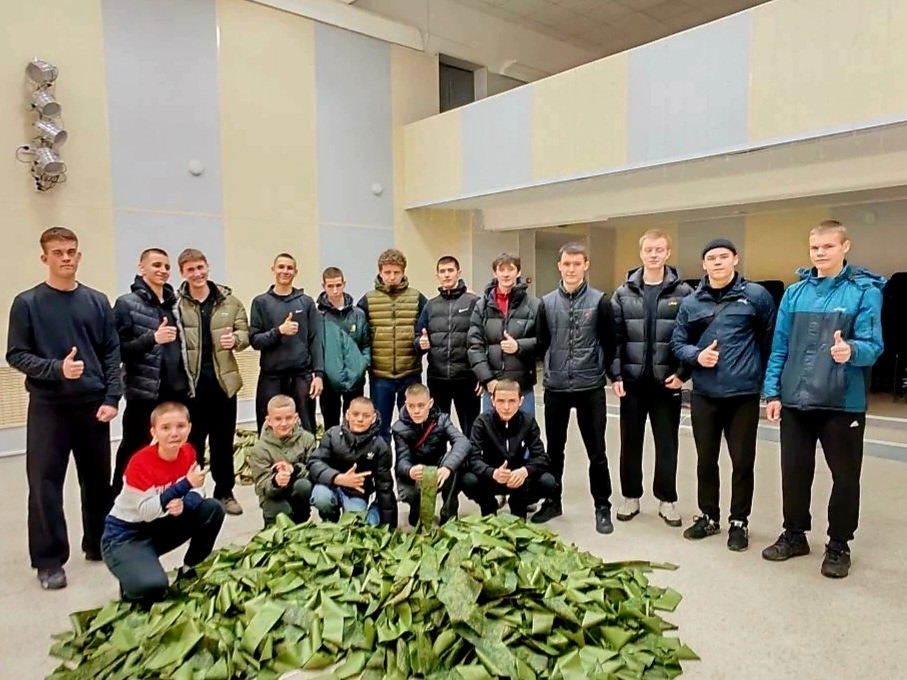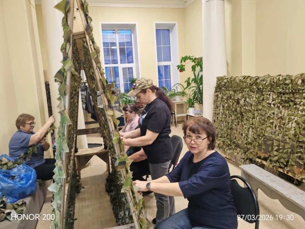 Патриотический отряд "Za Родину" и региональное молодежное патриотическое братство "Пересвет" в Октябрьском Доме культуры 27 марта 2026 года объединили свои усилия по изготовлению большой партии маскировочных сетей для воинов СВО.
