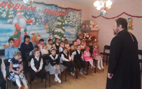 Священник храма св. Блж. Матроны Московской иерей Виктор Турович рассказал детям о празднике а детки прочитали стихи посвященные событиям Рождества Христова.