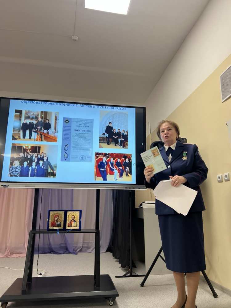 На семинаре Елена Анатольевна рассказала руководителям о выборе компонента ОПК, масштабах преподавания духовно-нравственных ценностей и воспитании с применением казачьего компонента в Бряндинской школе.