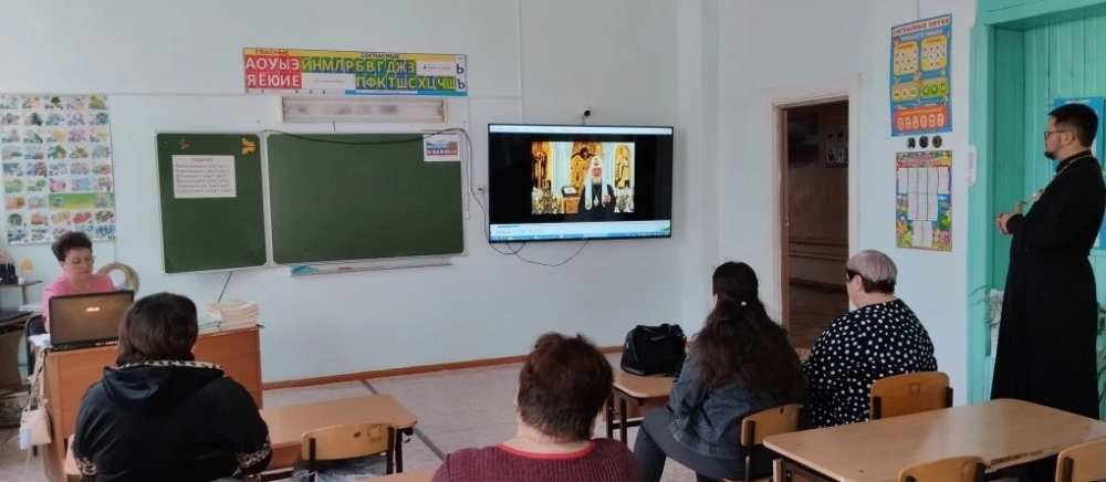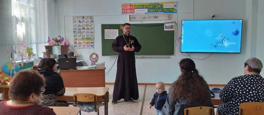 Представители Старомайнского благочиния, настоятель прихода иконы Божьей Матери Боголюбивая с. Ивановка иерей Сергий Исаков и катехизатор Бобырева И. Г. встретились с коллективом педагогов школы и родителями.