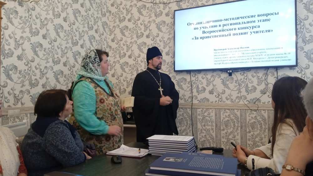 В числе выступавших был руководитель Отдела религиозного образования, катехизации и миссионерского служения Мелекесской епархии протоиерей Александр Ижуков. Он, как эксперт конкурса, рассказал об организационно-методических вопросах участия педагогов в региональном этапе. Также своим опытом участия и победы в конкурсе поделились сотрудники детского сада №47 "Веселинка" г. Димитровграда.