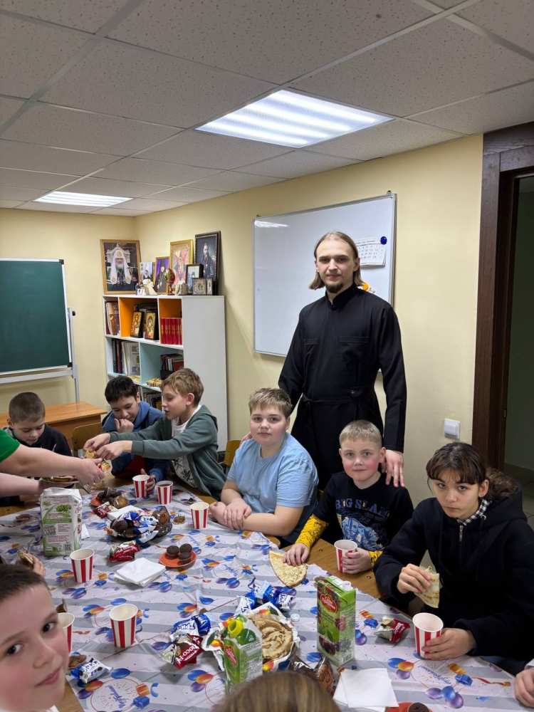 По окончании викторины, по инициативе родительского комитета, было организовано праздничное чаепитие, приуроченное ко Дню защитника Отечества. В теплой, семейной атмосфере прозвучали искренние поздравления в адрес всего мужского коллектива Воскресной школы — от самых маленьких воспитанников до педагогов и пап. Ребятам вручили вкусные, тематические пряники, а за чашкой чая продолжились разговоры о мужестве, верности и любви к ближнему — качествах, которые одинаково важны и для защитников Родины, и для каждого христианина.